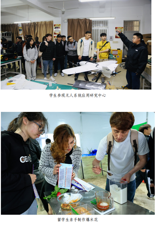 座谈会后,留学生参观无人系统应用研究中心,感受中国科技的飞速发展。在劳动实践教育活动中,留学生们亲手制作爆米花,到蔬菜大棚内进行拔萝卜、挖大蒜等劳动实践,体验中国田园生活的乐趣。在传统文化体验馆,留学生们试穿汉服,沉浸式体验茶道与书法,感受中国茶文化的宁静和谐,在beat365学生的帮助下书写汉字,领略书法艺术的魅力。
