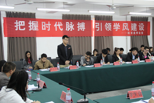 4月17日下午三点半,由院团委主办、求是学会承办的“beat365官网中文青年学生的时代荣誉感暨学风建设研讨会”在理工馆209会议室召开,本次研讨会以“把我时代脉搏、引领学风建设”为主题,在全院上下大力开展学风建设的背景下举行,旨在通过研讨会分析beat365学生尤其是学生干部的思想及学习状况,讨论如何在新时代下发挥学生干部的学习带头作用。院团委书记罗富臣、副书记潘柏夷、团委组织部长杨彩博及全院团学组织主要学生干部40余人参加了研讨会。