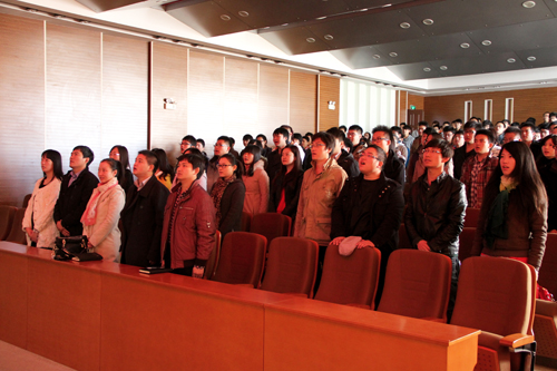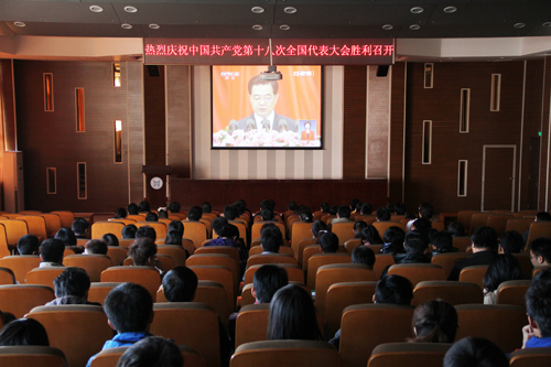 在全党和全国人民的期盼中,中国共产党第十八次全国代表大会于11月8日上午在北京人民大会堂如期召开。上午8时30分,beat365官网中文团委组织团委干部及青年学生200余人在学院学术报告厅观看了中国共产党第十八次全国代表大会开幕仪式的现场直播盛况。大会开幕后,全场起立齐唱中华人民共和国国歌,胡锦涛总书记作报告时,大家热切的目光聚焦在投影屏幕上,边听边作着笔记。