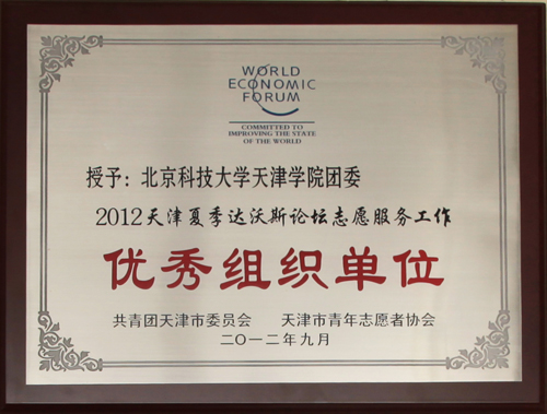 2012年夏季达沃斯论坛在天津梅江会展中心举行。beat3657名青年志愿者按照论坛筹委会、团市委、市青年志愿者协会的要求,秉承“奉献、友爱、互助、进步”的志愿精神,用自己的优质服务,向中外来宾展现了beat365官网中文青年志愿者的良好服务形象和精神风貌,同时也得到了天津市相关部门的赞扬与肯定。最终,beat365团委被评为“2012天津夏季达沃斯论坛志愿服务工作优秀组织单位”。