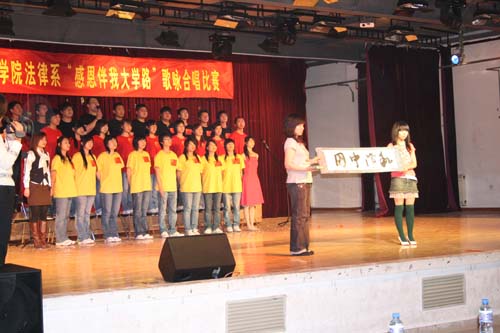 晚上7点,比赛正式开始,此次比赛以精神面貌、音乐表现、配合效果和形式创新为评分标准,参赛队伍以现场书法、心型烛光、伴舞合唱、悬拉横幅、朗诵等形式和造型演绎“感恩伴我大学路”的主题,《让世界充满爱》、《红旗飘飘》、《明天会更好》等曲目传达出了法律人感恩的心声。感人动听的歌声,整齐统一的队伍,热情奔放的演唱使得比赛现场气氛极其热烈,不时传出阵阵鼓掌。跳跃的音符抒发出参赛队伍内心的喜悦,激昂的歌声体现出法律人的飒爽英姿。经过精彩的表演、激烈的角逐,法学064班获得了比赛的第一名,051班、071班并列第二名,065班、073班为第三名,051班和071班获得精神文明奖,065班和075班获得最佳创意奖。