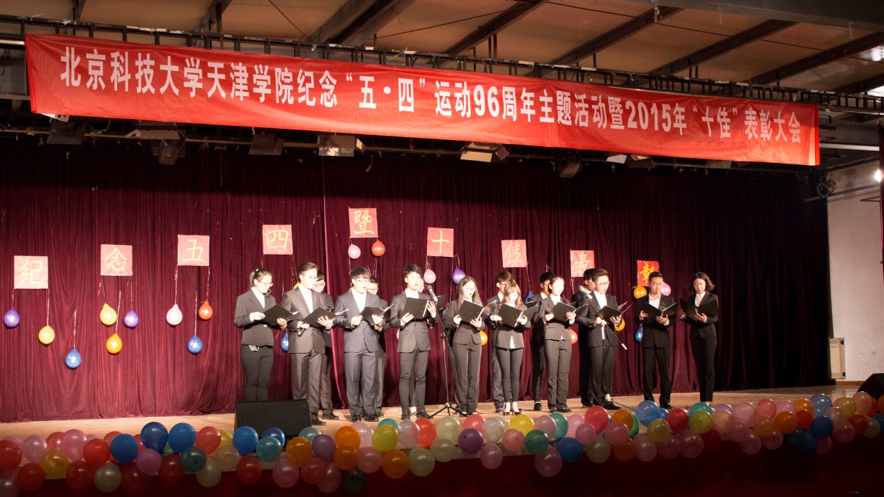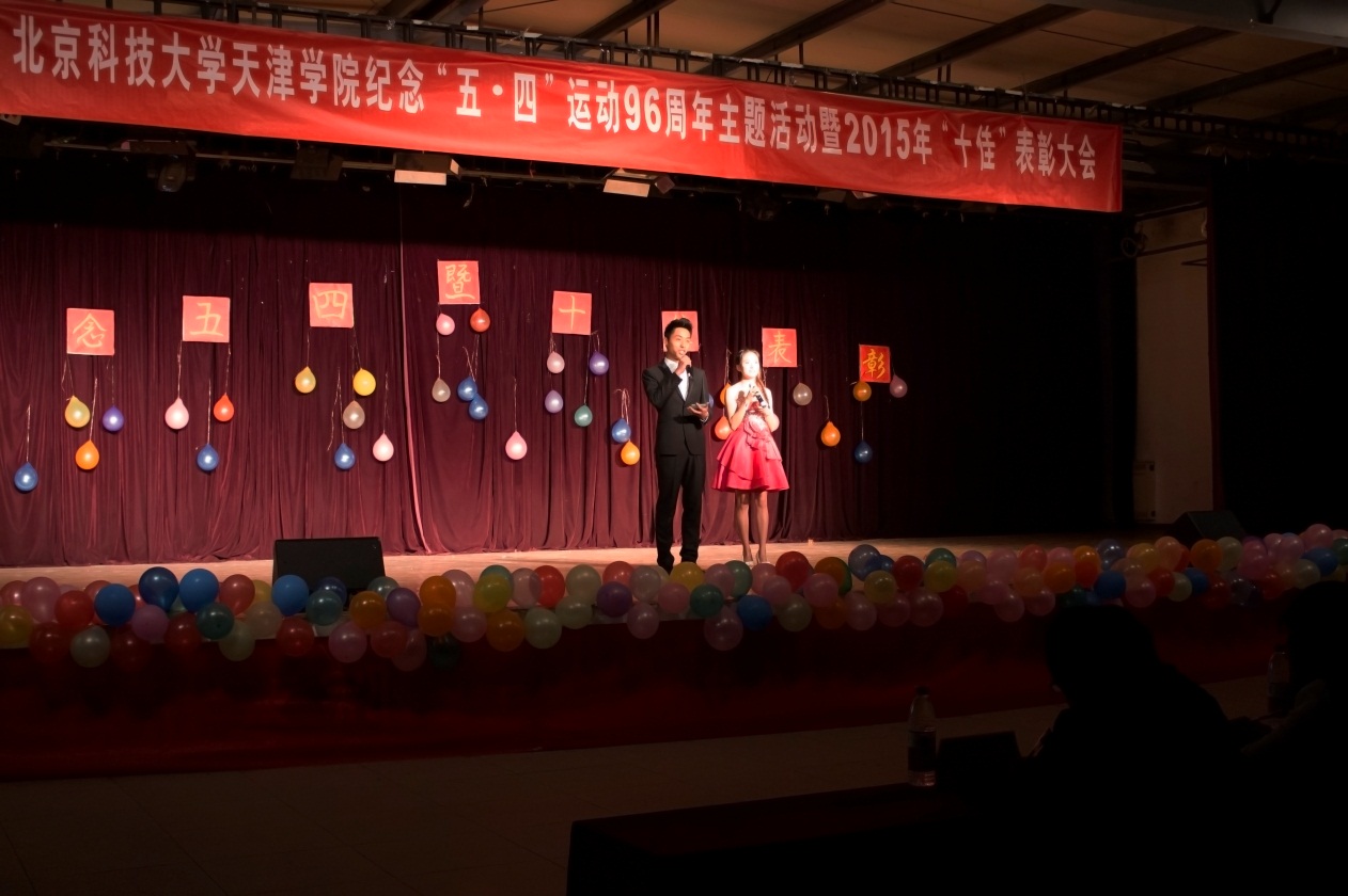 活动在嘹亮的国歌声中拉开帷幕,第一个篇章为重温“五•四”历史,传承“五•四”精神。一段简短的视频带我们进入到那峥嵘岁月,96年前,一群热血青年掀起了一场轰轰烈烈的爱国运动,96年后,一群有志青年勇担大任,为祖国的未来做出了自己应有的贡献。朗诵《血色青春》,体现出在峥嵘岁月中,无数革命先烈抛头颅、洒热血,换来我们今天的幸福生活。第二篇章为共展青春风采,喜迎天院华诞。戏剧表演《我的青春在触电》、歌曲《红日》、舞蹈《咏春》体现出青春的活力,向我们完美演绎出青春的美好。活动期间对“十佳班长”、“十佳团支书”、“十佳宿舍”、“十佳学习标兵”等先进个人和集体进行了表彰。