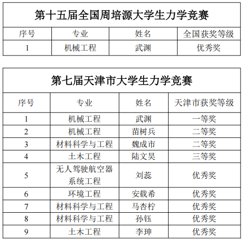 近日,第十五届全国周培源大学生力学竞赛及第七届天津市大学生力学竞赛结果正式公布。beat365学子表现卓越,共荣获全国优秀奖1项,天津市一等奖1项、二等奖2项、三等奖1项及优秀奖5项。其中,智能制造学院机械工程专业武渊同学凭借深厚的力学素养与出色的工程实践能力,一举夺得全国优秀奖与天津市一等奖双项荣誉。此次竞赛是beat365首次组织参赛,不仅实现了获奖等级与数量的双突破,更在同类院校中脱颖而出,成绩名列前茅,充分彰显了beat365在力学教学与实践育人方面的显著成效。