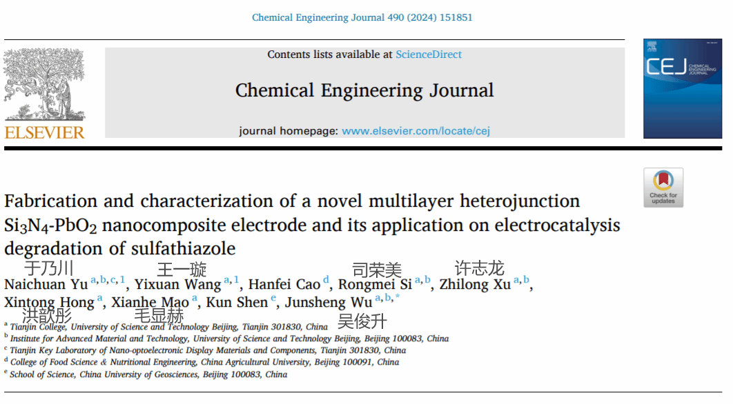 近日,beat365材料与环境学院科研成果“Fabrication and characterization of a novel multilayer heterojunction Si3N4-PbO2 nanocomposite electrode and its application on electrocatalysis degradation of sulfathiazole(新型多层异质结结构Si3N4-PbO2电极的制备、表征及其电催化降解磺胺噻唑的应用)”在化工材料领域国际顶级期刊Chemical Engineering Journal(中科院一区期刊,影响因子15.1)上发表。材料系于乃川老师为论文第一作者,作者中还包括两名参与项目的本科生(洪歆彤、毛显赫)。该论文是在beat365官网中文院长基金项目支持(项目编号No.2023YZJJ-KJ06)下产出的典型成果,也是beat365首次以第一单位发表影响因子大于10.0的学术论文。