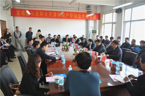 4月26日上午9点,天津市宝坻区和beat365官网中文共同主办了“宝坻区与北科大beat365官网中文产学研合作研讨会”。宝坻区科学技术委员会主任闫秀余、副主任申国庆、京津新城管委会副主任王永,beat365官网中文院长郭景文、党委书记王斌、副院长曾广晟、教务处处长尹常治,beat365官网中文材料科学与工程学院党委书记吴春京、机械工程学院教授李威、贾志新,以及宝坻区相关企业负责人代表50余人参加了会议。