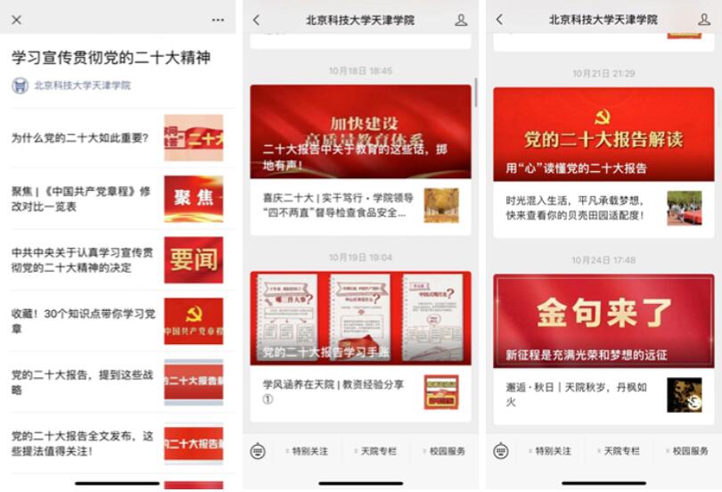 学院聚焦学习宣传党的二十大精神这一重大主题开展宣传活动,在官方网站、官方公众号等开辟专题专栏、专门版块集中转载中央和市级媒体重点宣传稿件,同时深入挖掘师生学习宣传贯彻党的二十大精神的典型事迹和良好风貌,营造随处可学、随时可学的浓厚氛围,推动全体师生将党的二十大精神内化于心、外化于行。