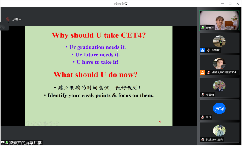 梁素芹教授通过精析2013年至2022年真题,详细、全面的为同学们讲解了四六级试卷结构,总结了四六级考试命题规律,介绍了写作、听力、阅读、翻译不同题型的备考策略、应试方法、丢分点及应对策略。讲座最后,梁教授鼓励大家树立信心,利用暑假时间认真备考,争取在考试中取得优异成绩。