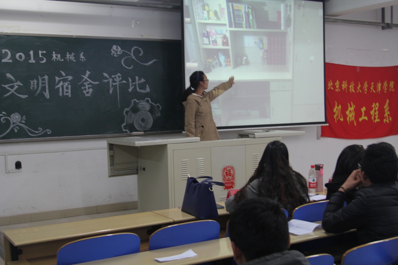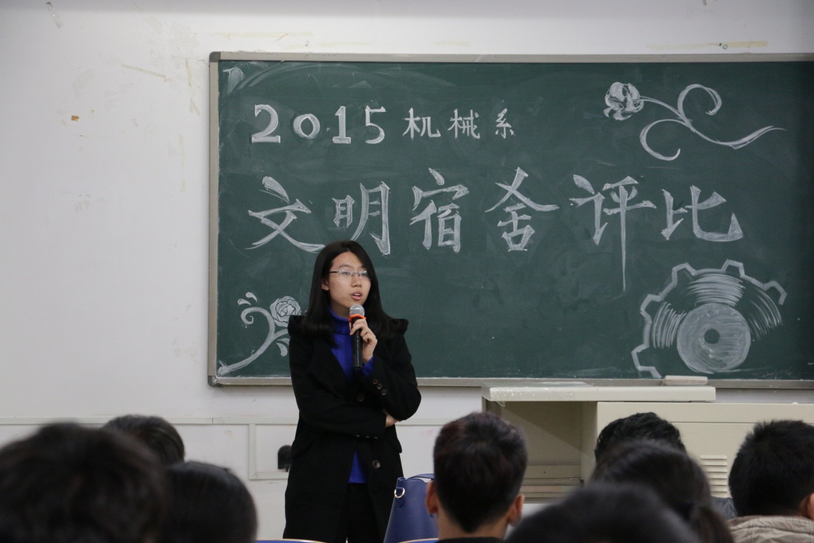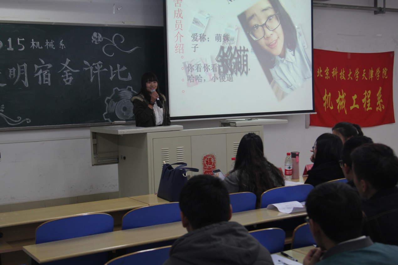 活动一开始,主持人介绍了此次文明宿舍评比活动是在系领导的指导下,经过系学生会生活部检查、统计之后,从15级机械系的宿舍中选出了9个优秀宿舍进行本次评比。