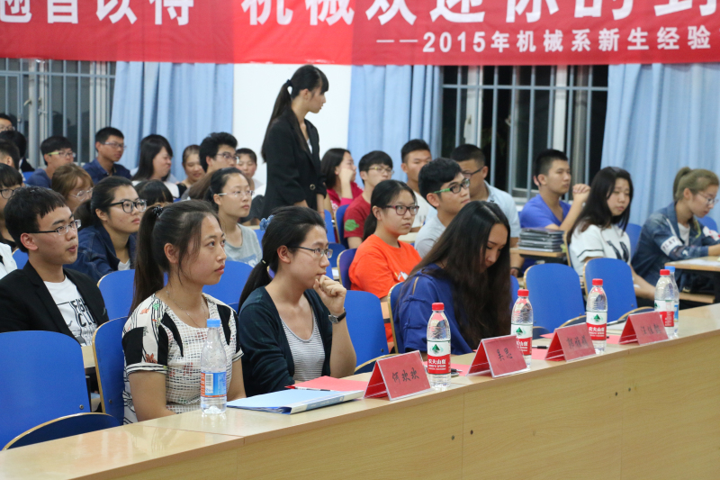 9月16日晚7点,在beat3658教101室,机械系举办了2015届新生经验交流大会,机械系党总支书记郭雅娟,机械系团委书记吴思,15级导员何欢欢、汪佳懿,Mooc学社主席赵忠,以及机械系分团委学生会主席团和部长团出席此次大会。