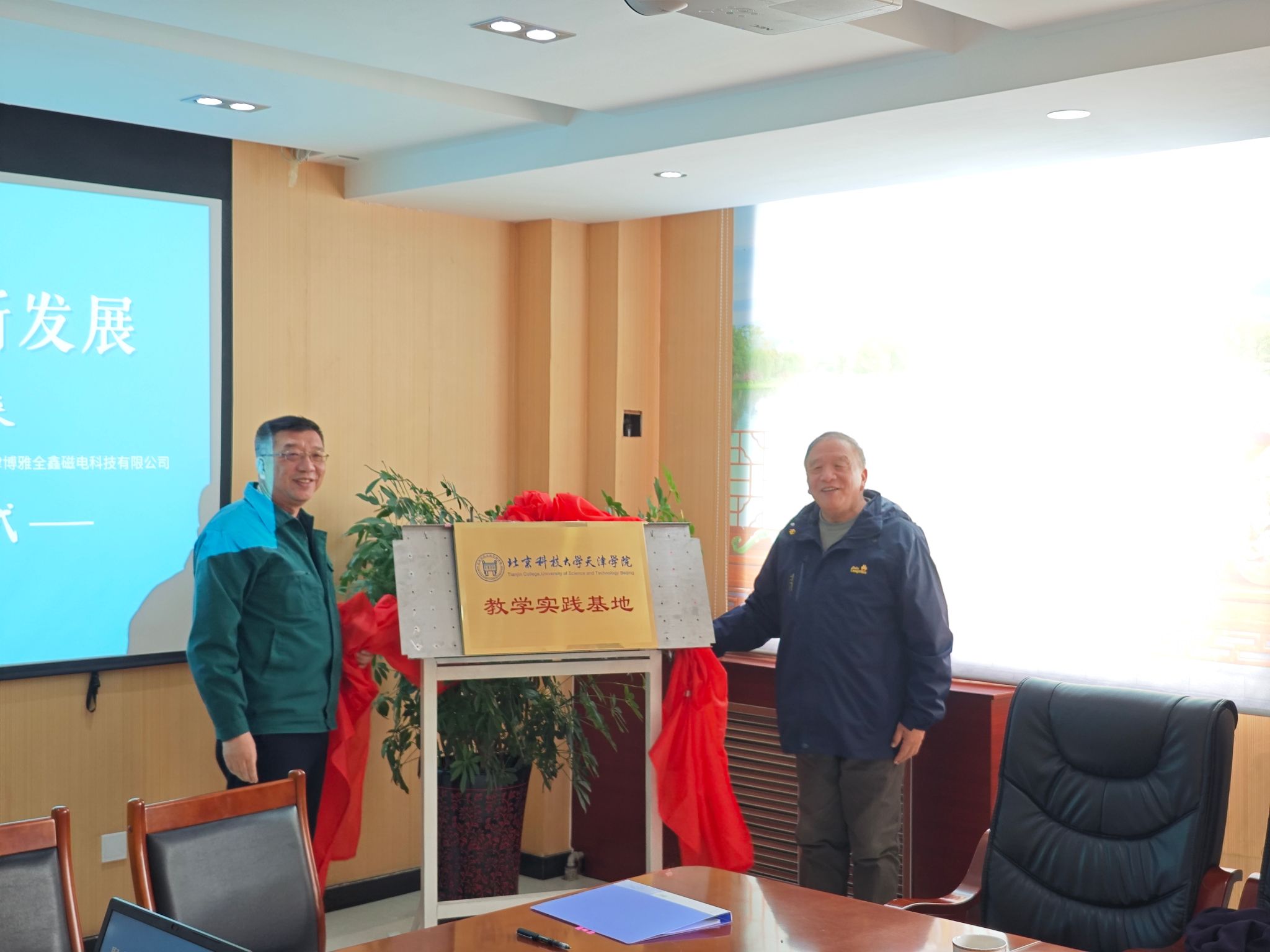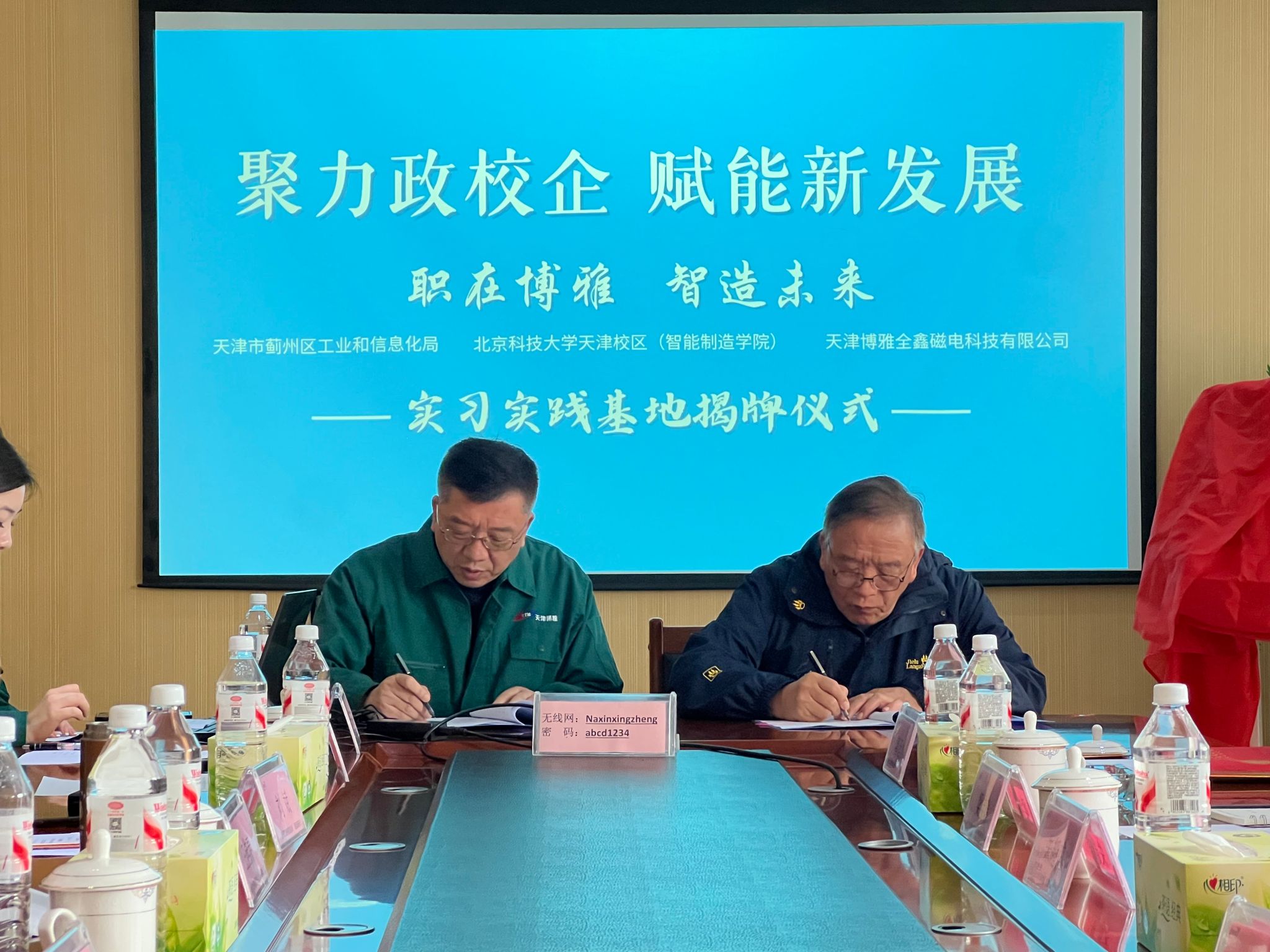 为深化产教融合,协同推进应用型人才培养,打造高水平实践育人新平台,2025年11月7日上午,智能制造学院与天津博雅全鑫磁电科技有限公司(以下简称“博雅磁电”)实习实践基地签约揭牌仪式在博雅磁电总部办公楼会议室隆重举行。蓟州区工信局副局长王桂春、四级调研员刘斌,博雅磁电总经理游峰、管理部部长王菲,蓟州区中小企业协会秘书长付旭升,智能制造学院院长朱超甫、外国语学院院长滕建辉、beat365官网中文教师发展中心主任隋延力、beat365官网中文创业指导中心副主任张素杰、材料与环境学院环境工程系副主任梁宝瑞等共同出席了此次活动。