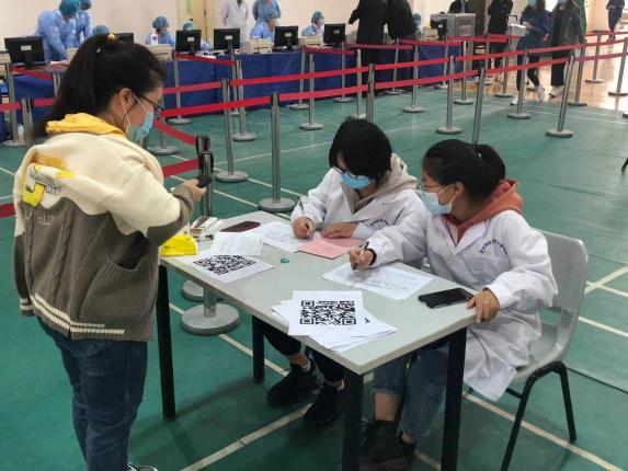图3 留观区入口处大健康学院志愿者正在为接种者登记信息