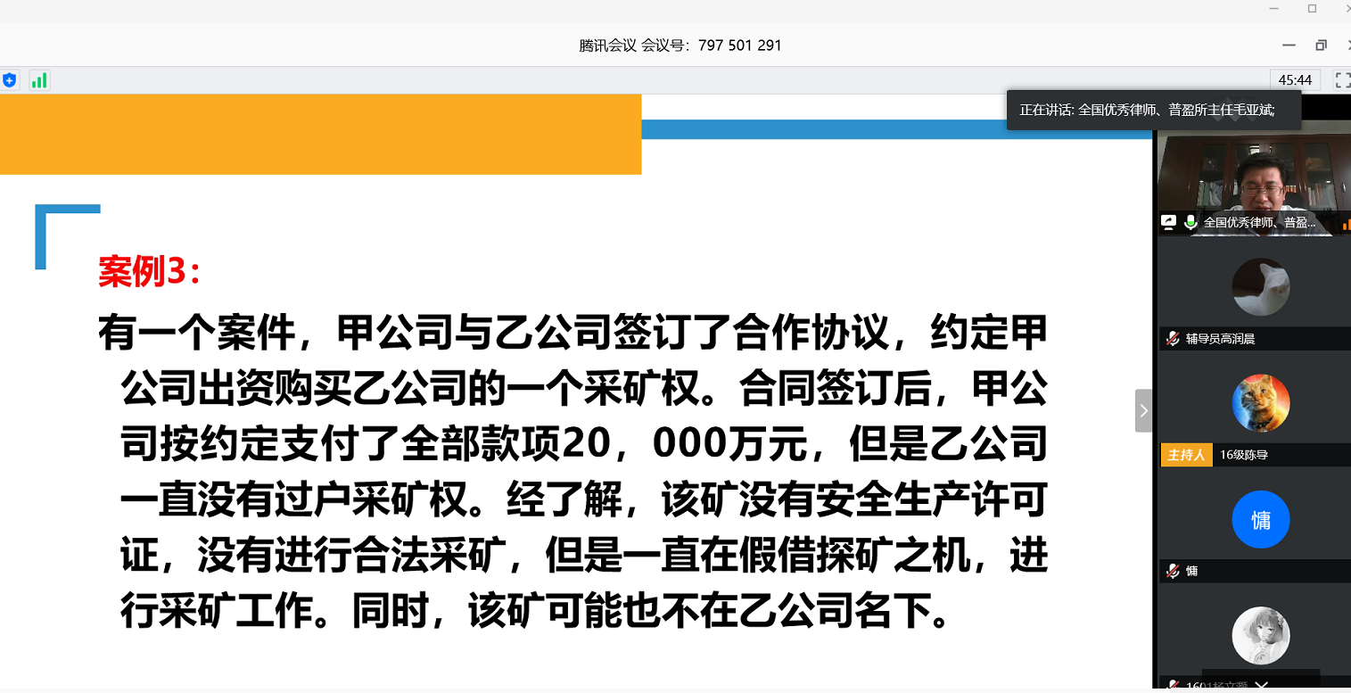 5月1日下午,全国优秀律师、北京普盈律师事务所毛亚斌主任为我系师生做了“诉讼技巧与诉讼法律风险防控”专题讲座,法律系主任朱京安教授、党总支书记冯海燕、专职教师和辅导员以及各年级学生,共计780余人参加本次在线讲座活动,讲座由党总支书记冯海燕主持。