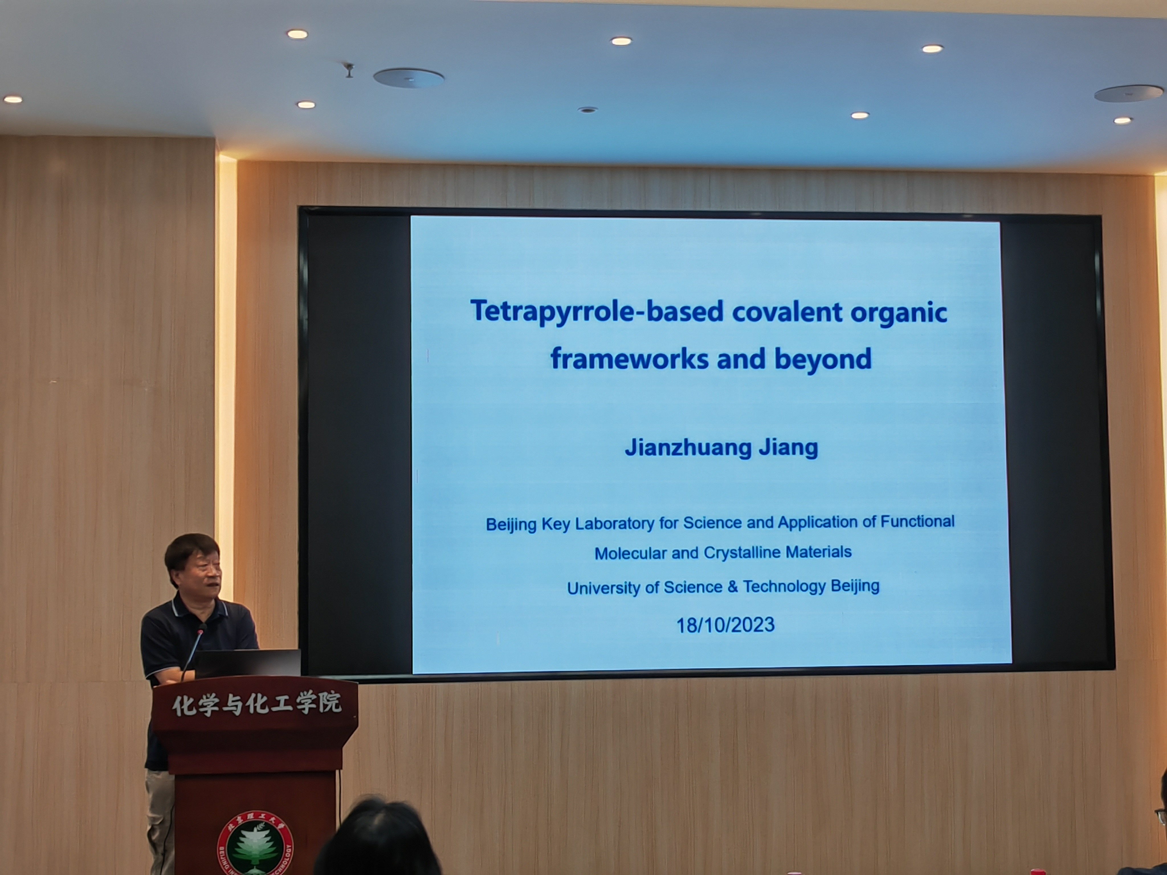 应威尼斯9499登录入口邀请,北京科技大学姜建壮教授于2023年10月18日1400做客北理工“百家大讲堂”,为我院广大师生带来题为“Tetrapyrrole-based covalent organic frameworks and beyond”的精彩报告。本次报告在生态楼118会议室进行,由张杰老师主持,近六十名化院师生参加了报告。