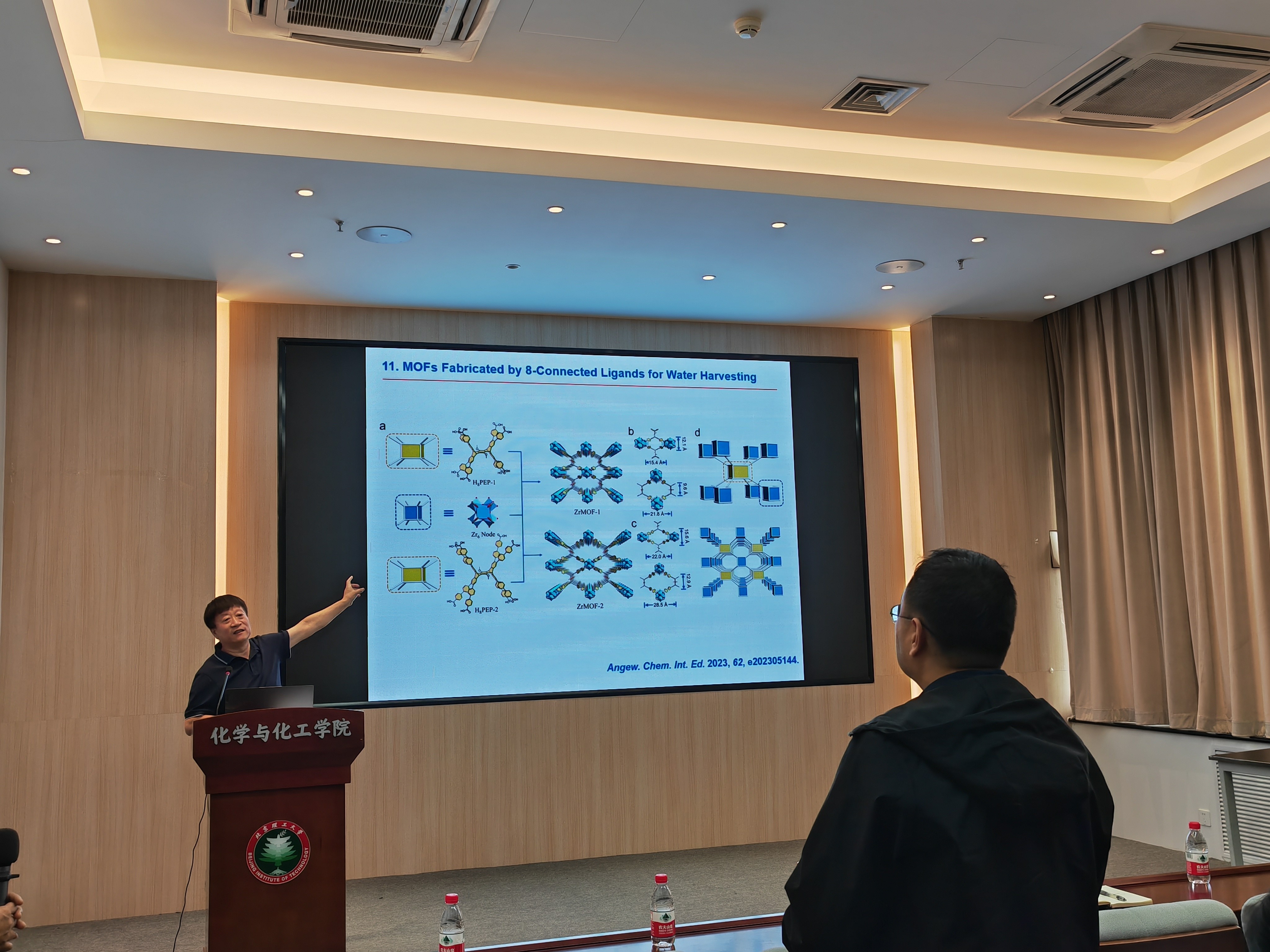姜建壮教授首先向广大师生介绍了分子基框架的发展以及分子基物质的类别与作用本质,由此引出共价有机框架的研究背景。接着姜建壮教授介绍了共价有机框架(COFs)目前从合成到应用层面所面临的难点,并基于此介绍了课题组从贵金属负载的二维COFs材料到三维酞菁基COFs材料的设计合成策略,以及基于不同结构特点的COFs材料所开发的不同的应用。在三维三维酞菁基COFs的合成中首次实现了大尺寸COFs单晶到单晶的转化。
