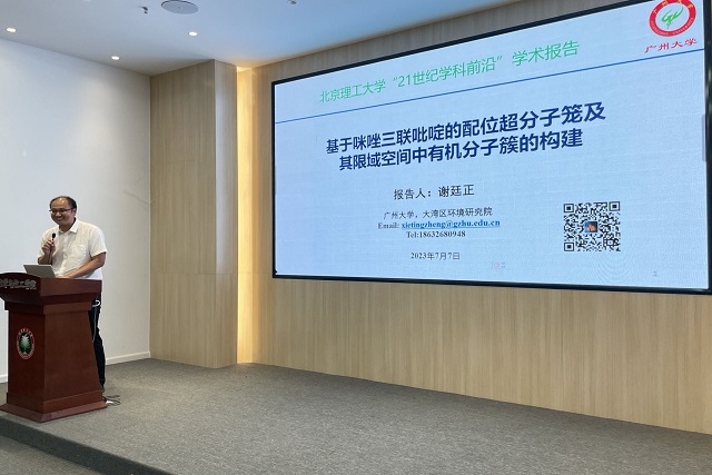 应威尼斯9499登录入口邀请,广州大学大湾区环境研究院谢廷正教授于2023年7月7日做客北理工“21世纪学科前沿”系列论坛,为我院广大师生带来题为“基于咪唑三联吡啶的配位超分子笼及其限域空间中有机分子笼的构建”的精彩学术报告。本次报告在生态楼118报告厅进行,由姚燎原老师主持,近六十名化院师生参加了报告。