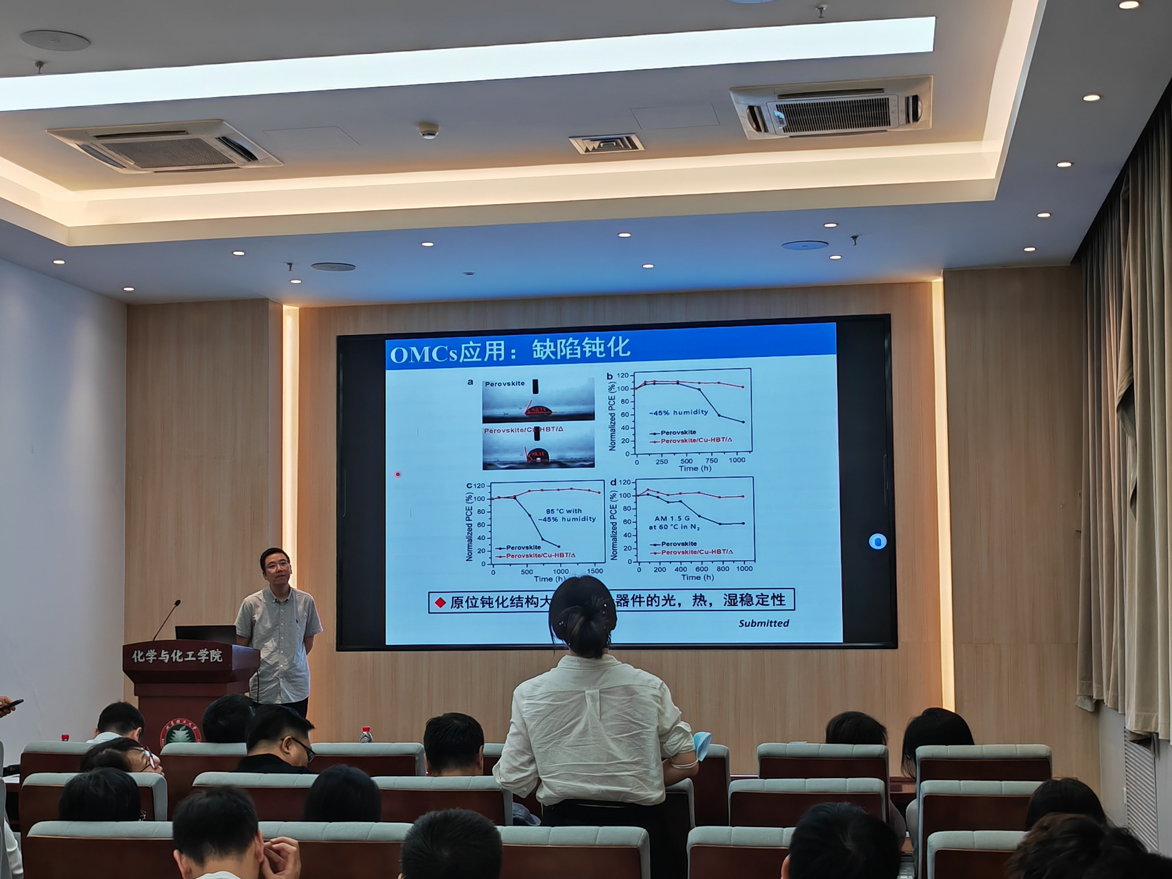 徐刚研究员首先介绍了二维材料,由于其超薄的厚度使其表现出不同于块体材料的优异的物理/化学性质,是物理、化学和材料等研究领域的热点。在无机二维材料的表面通过共价连接的方法修饰有机官能团,可以大幅度的调控和优化二维材料的性能。但现有策略通常都是先从块体材料剥离出二维材料,然后通过剧烈的化学反应进行后修饰的方法。这种先剥离后修饰的方法制备的二维材料通常其表面只有很少的比例可以被接上有机官能团,并且官能团的种类、数量和位置不清,分布无序,材料易产生缺陷。紧接着徐刚研究员介绍了课题组利用配位化学的方法先在块体材料内将二维材料表面修饰上官能团,然后剥离获得表面完全有机官能团化的二维材料的新策略。这种先修饰后剥离制备获得的新型二维材料具有一个二维无机层,有机官能团通过共价键长程有序的连接在二维材料的上下表面上。由于是基于配位化学的合成,该策略制备的材料具有制备简单、结构明确、体系拓展性强、官能团可设计等优点。与此同时,实验结果表明这类材料的带隙和导电性能可以被大幅度的调制,其调制幅度远超此前文献的报道。初步研究表明这类材料具有巨大的应用潜力,已在气敏探测和催化等方面表现出优异的性能。